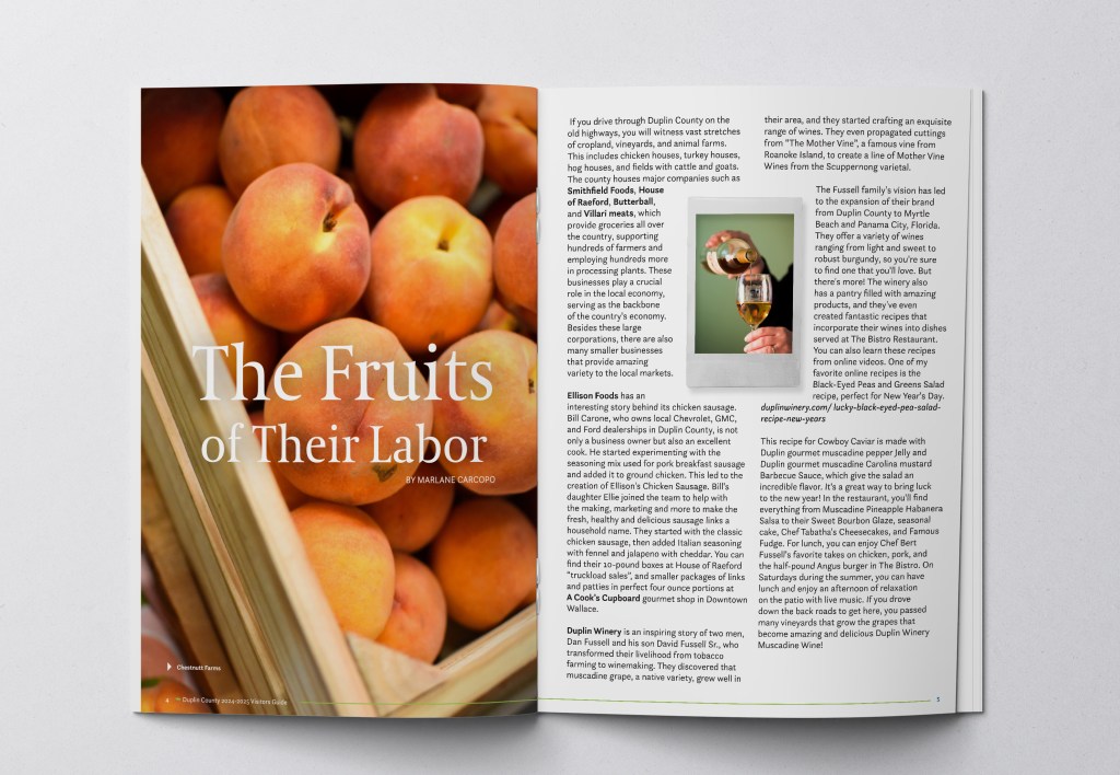 Guide commissioned by the Duplin County Visitor’s Center to share key insights for visiting their surrounding areas. This guide includes stories, listings, ads for local businesses and events coming in the next calendar year.